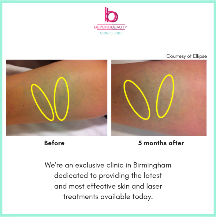 As we age, valves in our leg veins become less efficient, so less blood is pumped back from the legs. This means blood vessels in our legs become larger, darker and more visible. In severe cases, varicose veins may form and may require surgical treatment (vein stripping). Other vessels can be treated by injections (sclerotherapy). Smaller vessels (leg telangiectasias) are often treated by laser, such as the Ellipse Nd:YAG laser.